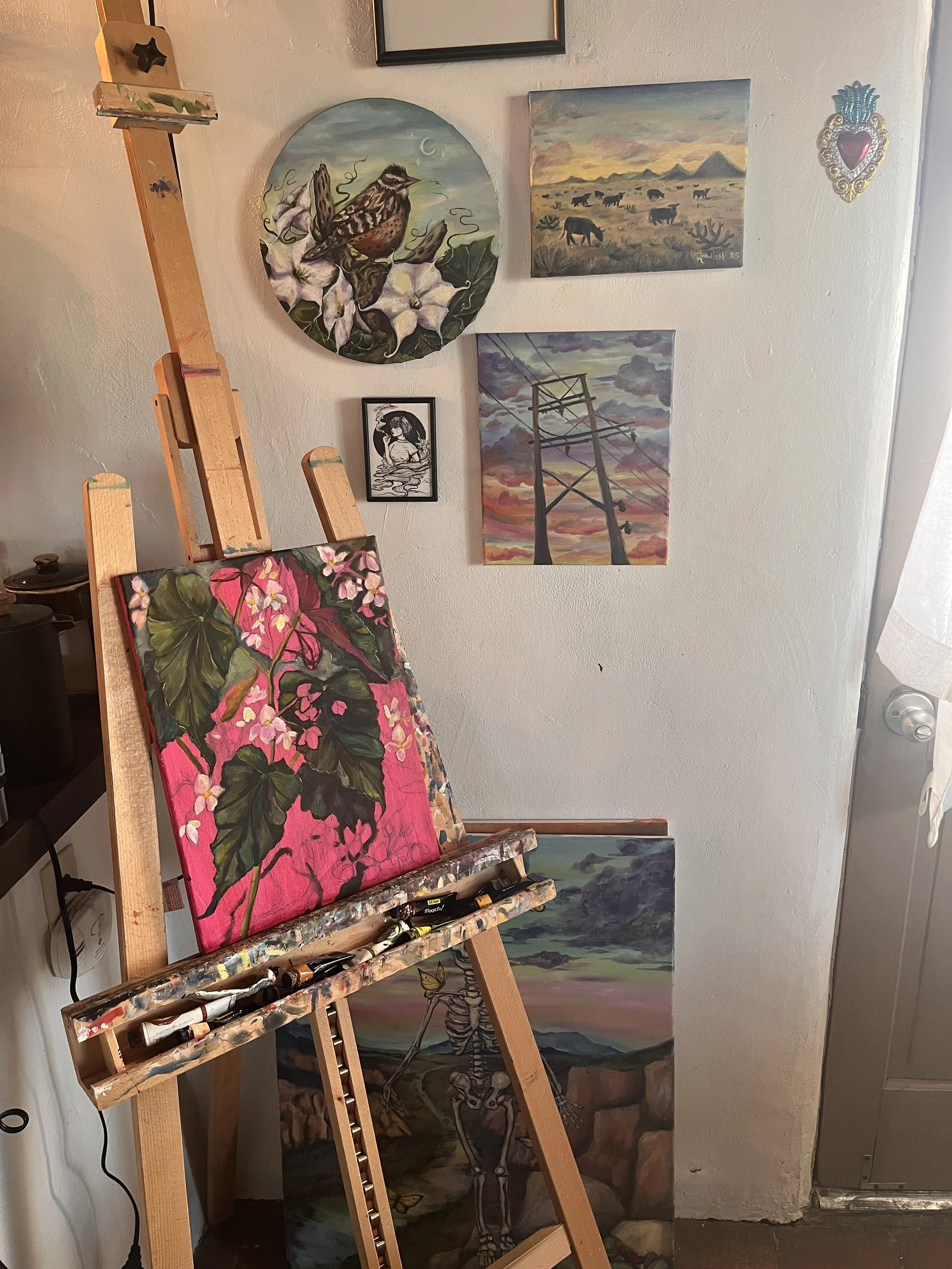 A self-taught artist from Santa Fe, New Mexico. I create whimsical and surreal subjects from a variety of mediums, with a recent focus on oil painting. I draw inspiration from storytelling, dreams and the landscape I call home. I’m a storyteller at heart and my work is an exploration of that.